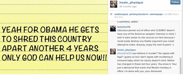 Sorry it is so small, but he basically is not happy about four more years of Obama. Someone comments on the post in support of Obama and Caleb decides to go into a homophobic and racist rant! He uses the term “fags” and calls President Obama a “Muslim monkey.” Whether you support Obama or not, he is still the President of the United States and he deserves your respect and honor. I don’t know what makes people think they can make comments like this and get away with it.