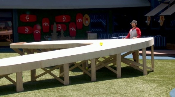 The HGs got indoor lockdown, but then were allowed in the backyard for a little bit, as part of the HOH competition was built and they got to practice. The note from production said they all should practice, so this led them to think there was a double eviction this week and this HOH comp would be the second one, especially since Vanessa was told to practice. It is a platform and rolling balls on it, so a total crapshoot and anyone could win.