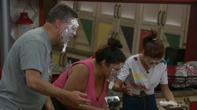 Nicole, Cliff, and Jessica get their punishment for the week! Throughout the week, Big Brother is going to tell them each to make a pie and then who and where to smash it in their face. The first round was for them to smash them into their own faces. They went to the storage room to find at least 60 pie crusts and a ton of whipped cream. They each grab a pie crust and a can of whipped cream and head out into the kitchen to make their pies. Here are some screenshots for your enjoyment: