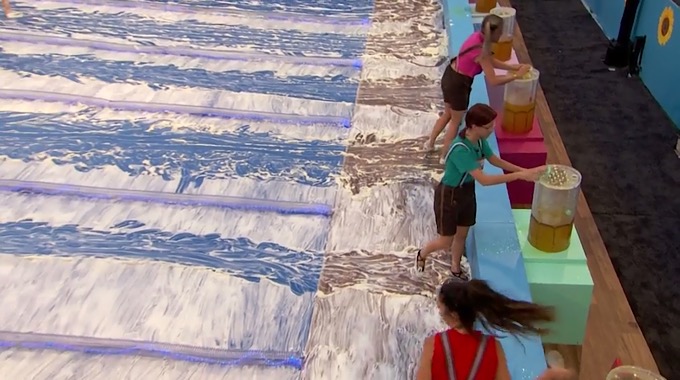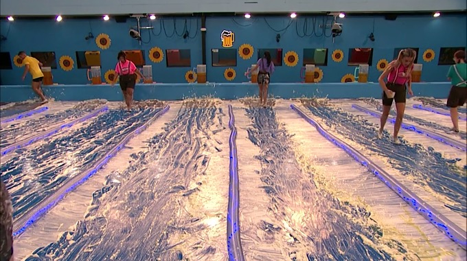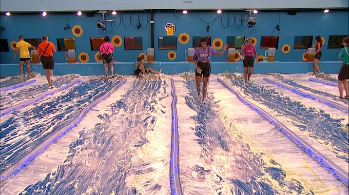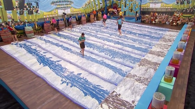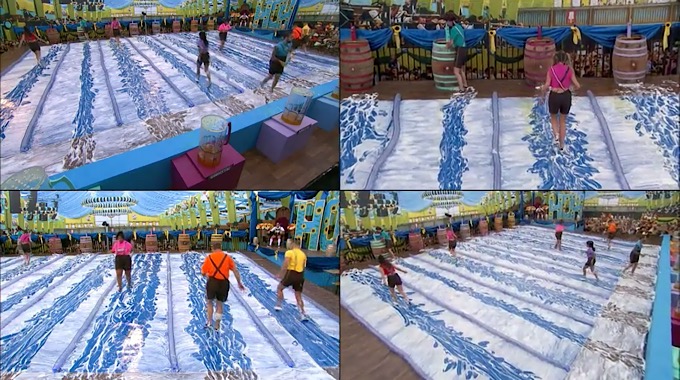 This comp is a slip and slide competition where the HGs will have to fill a mug with beer from a barrel at the top of their lane, they then have to slide down their lane and fill a stein at the end of their lane. The first HG to fill their stein and take their ping-pong ball out of it will win HOH!