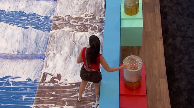 Jackson just said that he can touch the ball in his stein but still needs more in there to be able to grab it. Christie told him that he said weeks ago that he was going to win this comp and he tells her that he has to, he has no choice. I have to say, I’m surprised by how few times these HGs have fallen during this comp compared to years past. Also, this year, they weren’t offered a secondary prize to shoot for.