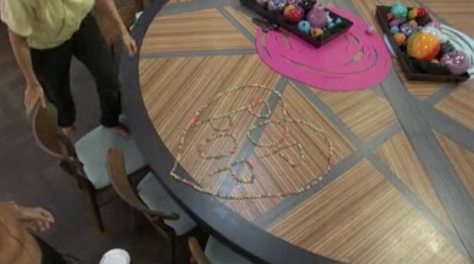 Tyler tells the rest of the house about Cody’s grandfather and they all go to comfort him. He thanks everyone for their support and tells them he just needs some time to process. After leaving the bathroom, Dani and Tyler wrote a message of support on the table with Froot Loops. It says “Pop Pop” and there is a heart around it.