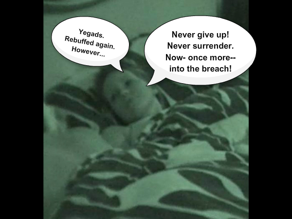But did Dani give up?? No. Not our little Princess. No WAY!–She only edged closer and closer before FINALLY going in for a–rebuffed–smooch.