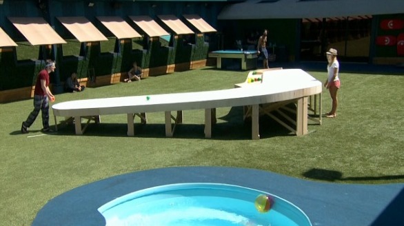 The HGs got indoor lockdown, but then were allowed in the backyard for a little bit, as part of the HOH competition was built and they got to practice. The note from production said they all should practice, so this led them to think there was a double eviction this week and this HOH comp would be the second one, especially since Vanessa was told to practice. It is a platform and rolling balls on it, so a total crapshoot and anyone could win.