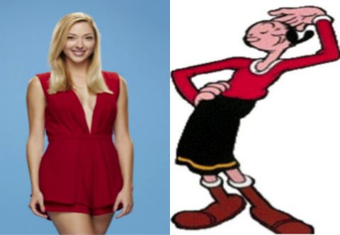 Liz has to be Olive Oyl. When the cartoon begins, Olive Oyl is either getting ready or already on a date with Brutus. It is only when the chips are down and it starts going in a direction she does not want, she calls for help. In any other season, the other guests would have never let her get past the week when the Twin Twist was discovered by the houseguests, but Brutus was there to save the day this year. Now she finds herself like Olive Oyl, alone, with Brutus trying to kiss her and no Popeye in sight to save the day. Maybe her sister smokes a corncob pipe.