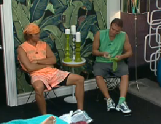 NEW–UPDATE!- Have/Have Not Comp over- Looks like the Have Nots are Brendan, Enzo, Monet and Britney- NOT Andrew!!. They were all wearing green, and will be allowed to eat Fish Sticks. I predict that Enzo will crack very quickly. Brendan is already close to tears because he cannot sleep with Rachel in the HOH! Rachel offered to sleep with him in the Have Not room. Puhleeze!